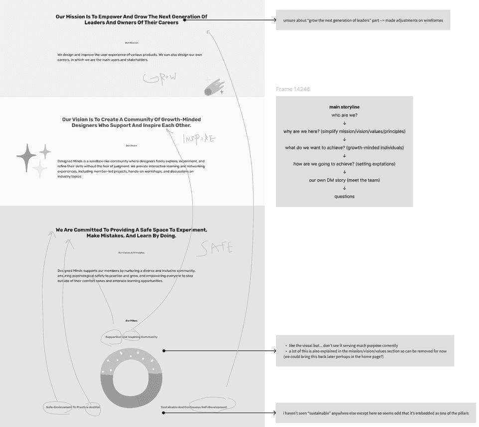 This meant pulling the site apart piece by piece: mapping out page flows, scribbling over screenshots, and analyzing how the current messaging aligned (or didn’t) with the community’s evolving identity.