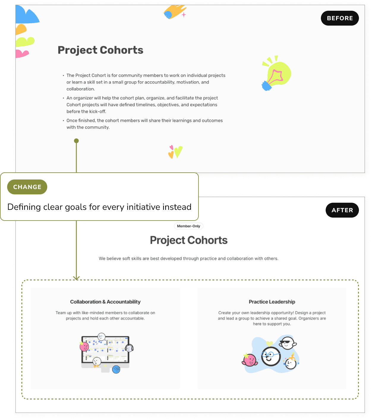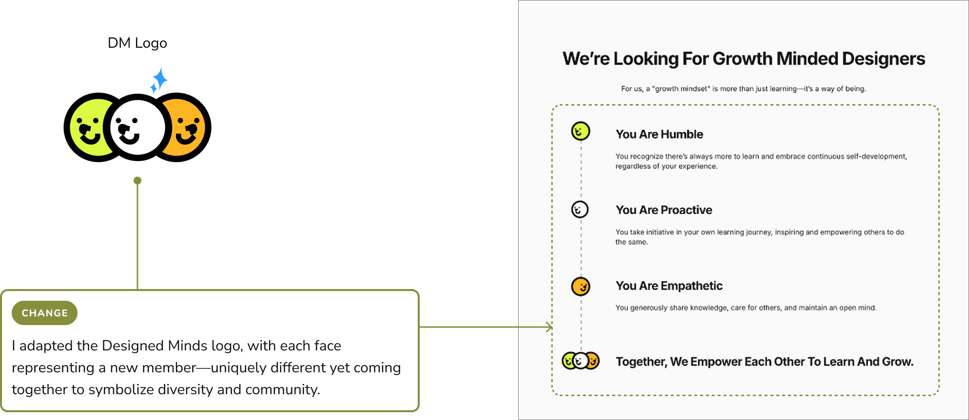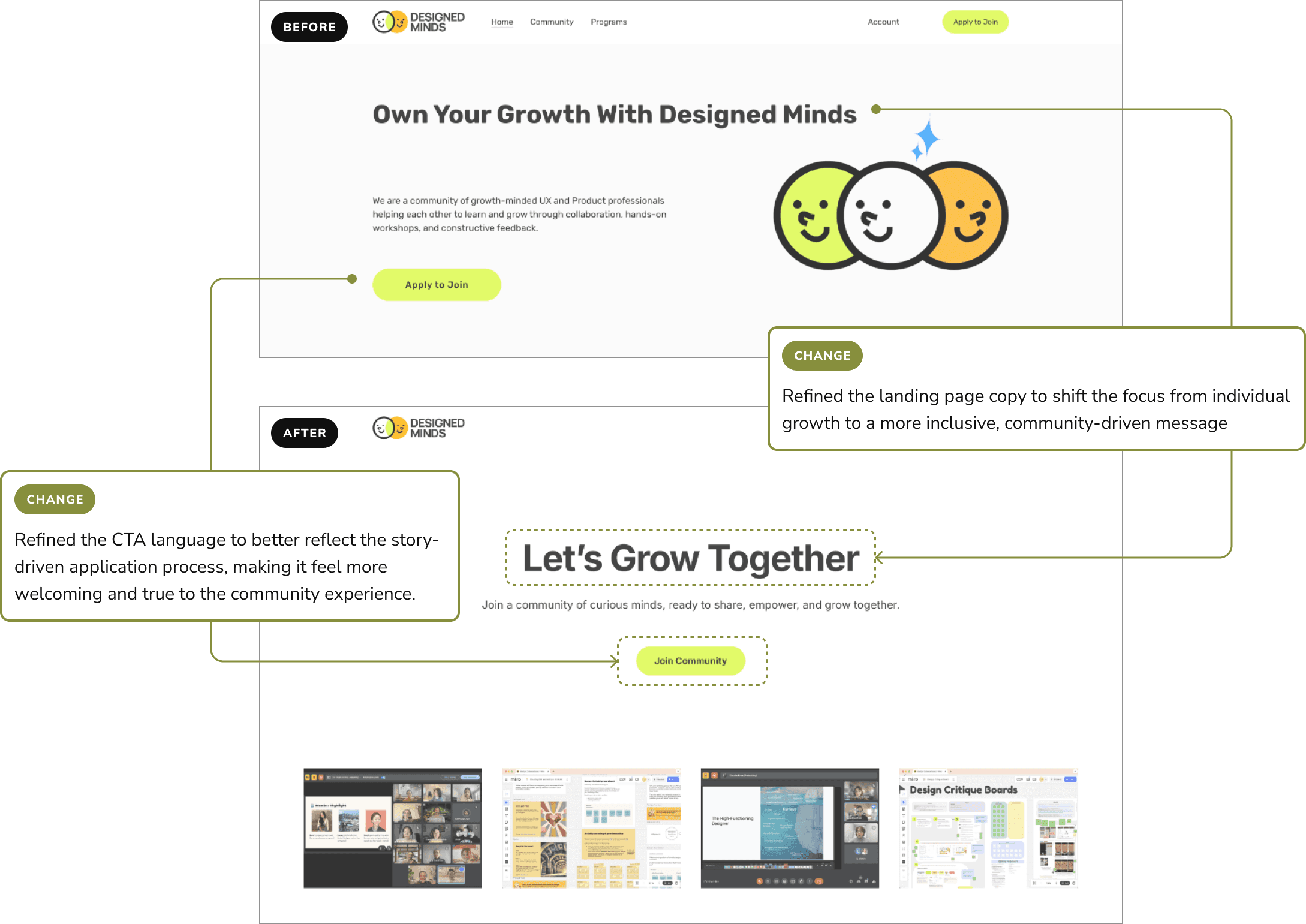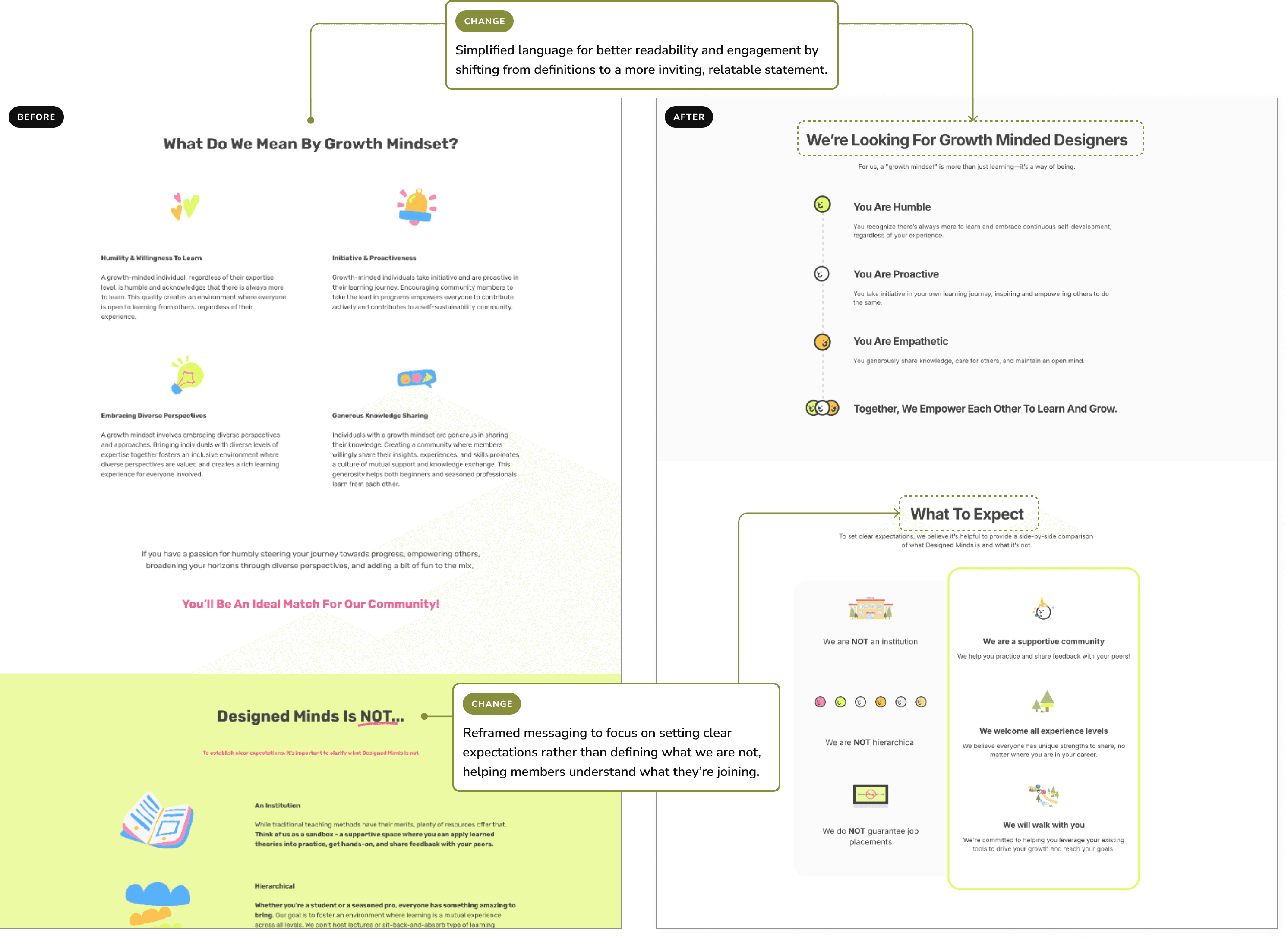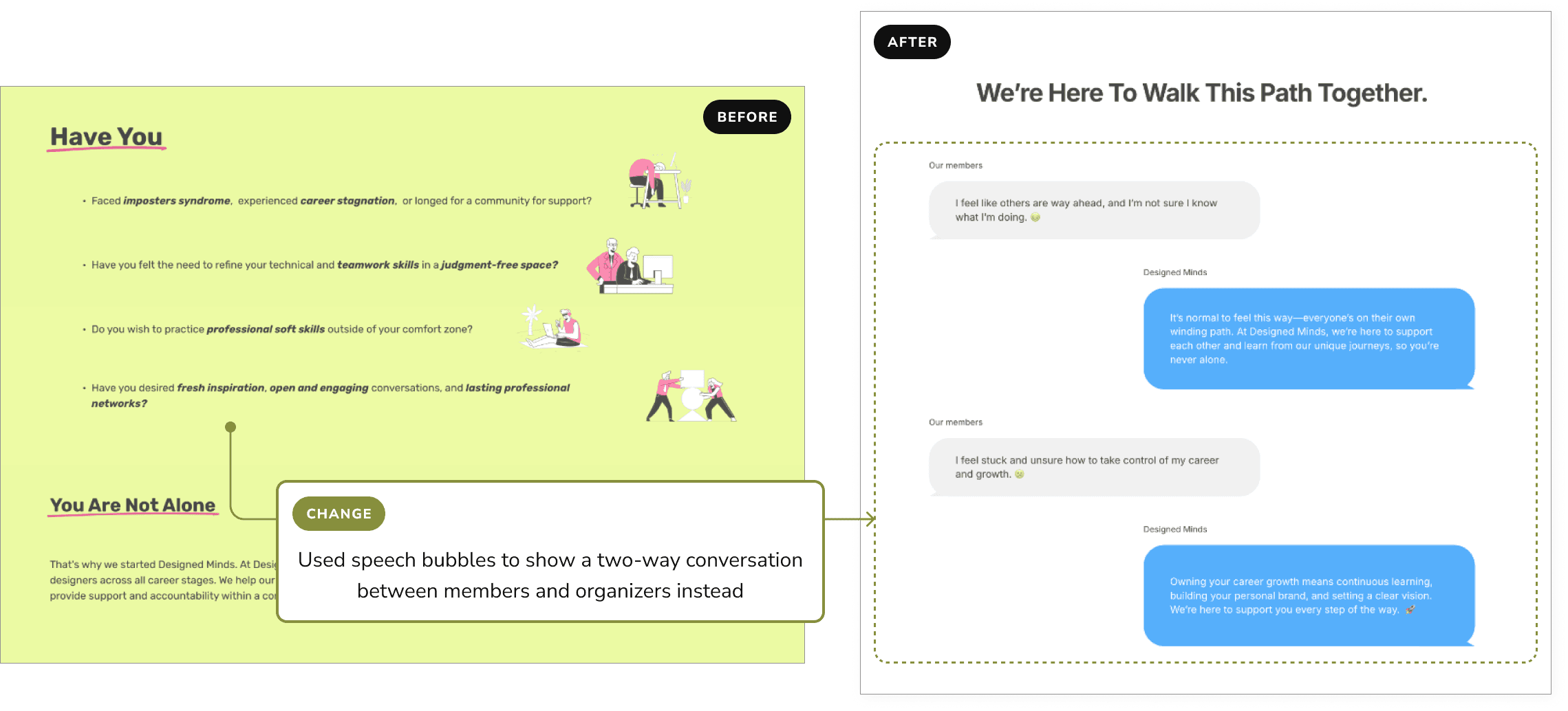 To reinforce Designed Minds' values of collaboration and inclusivity, I conducted a UX writing audit to refine key messaging across the website. Instead of positioning the community as a service that helps individuals, I shifted the language to emphasize shared experiences, mutual growth, and two-way conversations.